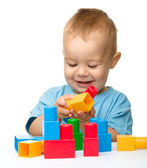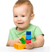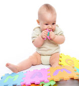 szczęśliwy chłopiec bawi się z alfabetu, siedząc na podłodze, na białym tle nad białym