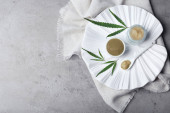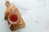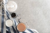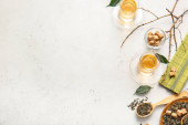 Herbata gryczana i granulki na jasnoszarym stole, płaskie ułożenie. Miejsce na tekst