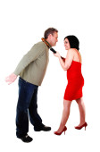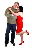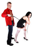 człowiek siedzi na podłodze przed kobietą w czarna bielizna i pończochy białe z wysokich obcasów na białym tle.