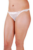 młoda kobieta shooing jej ładne ciało i nogi różowe majtki i biustonosz na białym tle.