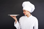 kucharz atrakcyjna kobieta pokazując ok na ciemnym tle
