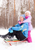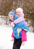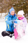 Szczęśliwa rodzina; młoda matka i jej córka zabawy w winter park