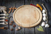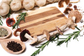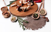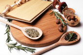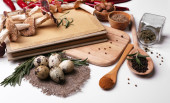 różne przyprawy i deski do krojenia, na białym tle