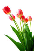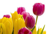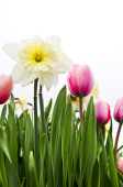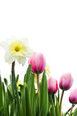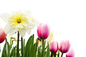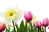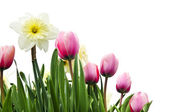 tulipany i żonkile na białym tle na białym tle, granica kwiatowy