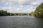 Permian, miasto, most, most komunalny w Perm, rzeka, Kama River, lato, lato, brzeg, wybrzeże, nadbrzeże, nabrzeże, nasyp, nasyp, drzewo, drewno, zieleń, panorama, horyzont, niebo, chmury, przestrzeń