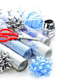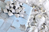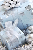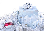 zapakowane w pudełka z srebrne ozdoby świąteczne na białym tle