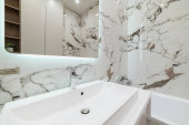 Zdjęcie "nowoczesny wystrój łazienki z marmuru płytek i drewna" może być wykorzystywane do celów osobistych i komercyjnych zgodnie z warunkami zakupionej licencji Royalty-free. Obraz jest dostępny do pobrania w jakości wysokiej rozdzielczości do 5760x3840.