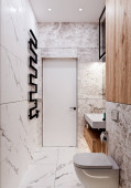 Zdjęcie "nowoczesny wystrój łazienki z marmuru płytek i drewna" może być wykorzystywane do celów osobistych i komercyjnych zgodnie z warunkami zakupionej licencji Royalty-free. Obraz jest dostępny do pobrania w jakości wysokiej rozdzielczości do 5760x3840.