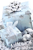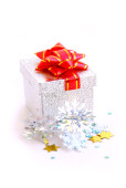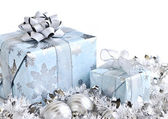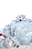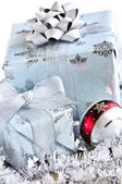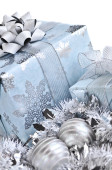 zapakowane pudełko z ozdób choinkowych na białym tle