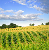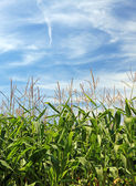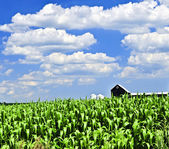 lato pejzaż pole zielonej kukurydzy i gospodarstwa