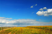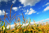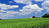 lato pejzaż pole zielonej kukurydzy i gospodarstwa