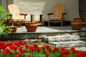 krajobrazowy podwórku domu z kwiatów i zielony trawnik