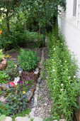 krajobrazowy podwórku domu z ogrodem kwitnienia i chodnik