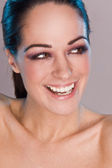 młoda brunetka kobieta stosuje krem na ramieniu, studio biały