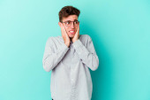 młody biały człowiek odizolowany na niebieskim tle wstrząśnięty pokrycie usta z rąk.