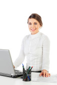 młody interesu uśmiechający się za pomocą tabletki na jej biurku