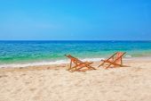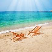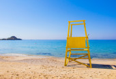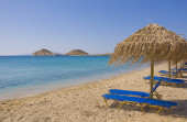 piaszczystej plaży, w pobliżu błękitnego morza z leżakami. Mykonos