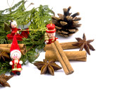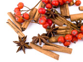 zbliżenie zdjęcie aromatyczny cynamon, Jarzębina, anyżu i stożki na białym tle
