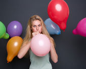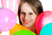 młoda kobieta uśmiechając się z kolorowych balonów