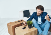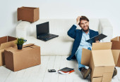 Biznes człowiek z laptopem siedzi na kanapie rozpakowywanie pudełek urzędnik
