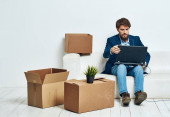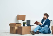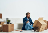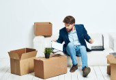 Mężczyzna siedzi na kanapie obok pudeł i rozpakowuje nowe miejsce do przeprowadzki.