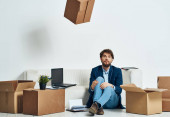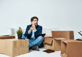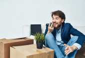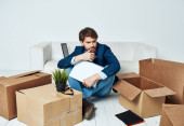 Zdjęcie "Mężczyzna siedzi na kanapie obok pudeł i rozpakowuje nowe miejsce do przeprowadzki." może być wykorzystywane do celów osobistych i komercyjnych zgodnie z warunkami zakupionej licencji Royalty-free. Obraz jest dostępny do pobrania w jakości wysokiej rozdzielczości do 5760x3840.