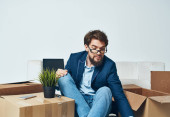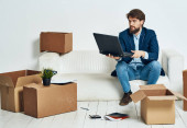 Biznes człowiek z laptopem siedzi na kanapie rozpakowywanie pudełek urzędnik