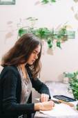 młoda kobieta studiuje i pisze w salonie