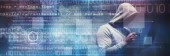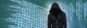 Skład migających listów i przetwarzanie danych nad hakerem noszącym kaptur. koncepcja cyfrowego bezpieczeństwa online generowana cyfrowo.