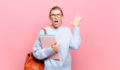 młody ładny student patrząc zaskoczony, otwarty usta, zszokowany, realizacji nowej myśli, pomysł lub koncepcja