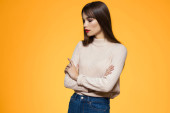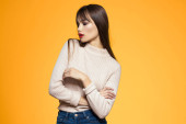 Zdjęcie "Cute brunetka makijaż czerwone usta modne ubrania żółte tło" może być wykorzystywane do celów osobistych i komercyjnych zgodnie z warunkami zakupionej licencji Royalty-free. Obraz jest dostępny do pobrania w jakości wysokiej rozdzielczości do 5760x3840.