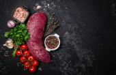 surowy wątróbka kurczaka z warzywami i przyprawami na ciemnym tle. Widok z góry. przestrzeń kopiowania.