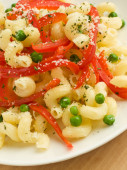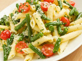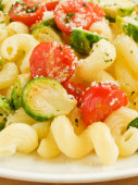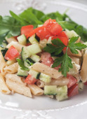włoski makaron penne z wędzonym łososiem i ogórkiem. płytkie dof.