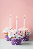 Kolorowe babeczki ze świecą odizolowane w niebieskim tle