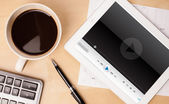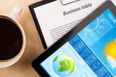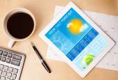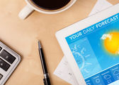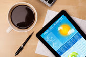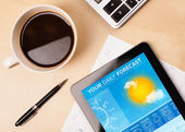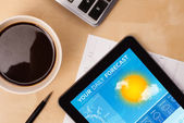 Prognoza pogody tabliczka pc wyświetlone na ekranie przy filiżance kawy