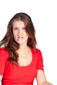 szczelnie-do góry to piękna młoda kobieta w czerwonej sukience na białym tle