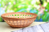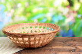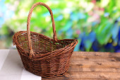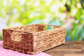 pusty wiklinowy koszyk na drewnianym stole, na jasnym tle