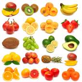 Melon, brzoskwinia, morela, ananas, persymona, jabłko, banan, kokos, cytryna, granat, śliwka, mango, winogrono, arbuz i inne izolowane na białym tle