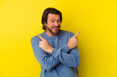 Zdjęcie "Biały mężczyzna w średnim wieku, odizolowany na żółtym tle, trzymający coś z dłońmi, oferujący kamerę.." może być wykorzystywane do celów osobistych i komercyjnych zgodnie z warunkami zakupionej licencji Royalty-free. Obraz jest dostępny do pobrania w jakości wysokiej rozdzielczości do 5760x3840.