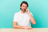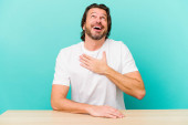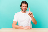 Zdjęcie "Średniowieczny Holender siedzi odizolowany na niebieskim tle osoba wskazując ręcznie na przestrzeń do kopiowania koszuli, dumny i pewny siebie" może być wykorzystywane do celów osobistych i komercyjnych zgodnie z warunkami zakupionej licencji Royalty-free. Obraz jest dostępny do pobrania w jakości wysokiej rozdzielczości do 5760x3840.
