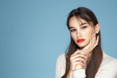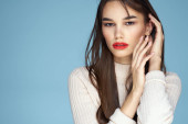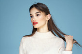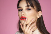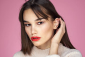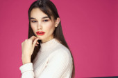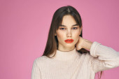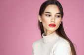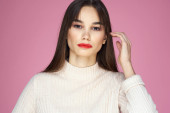 Brunetka z długimi włosami czerwone usta kosmetyki biały sweter różowy tło przycięte widok