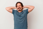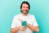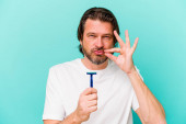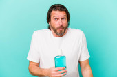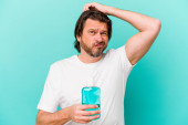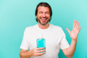Zdjęcie "Średniowieczny Holender siedzi trzymając płyn do płukania ust odizolowany na niebieskim tle podnosząc pięść po zwycięstwie, koncepcja zwycięzcy." może być wykorzystywane do celów osobistych i komercyjnych zgodnie z warunkami zakupionej licencji Royalty-free. Obraz jest dostępny do pobrania w jakości wysokiej rozdzielczości do 5760x3840.