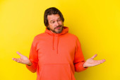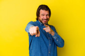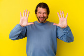 Zdjęcie "Holender w średnim wieku trzymający szczoteczkę odizolowaną na niebieskim tle uśmiechając się i wskazując na bok, pokazując coś w pustej przestrzeni." może być wykorzystywane do celów osobistych i komercyjnych zgodnie z warunkami zakupionej licencji Royalty-free. Obraz jest dostępny do pobrania w jakości wysokiej rozdzielczości do 5760x3840.