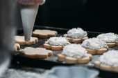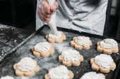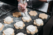 Kucharze ręce z torbą ciasta wyciskając ciasto śmietankowe do pieczenia
