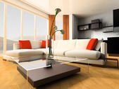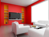 nowoczesny salon z czerwona kanapa i telewizor lcd wewnętrzne render 3d