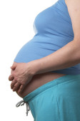 Profil kobiety w ciąży z kształt serca ręce na brzuchu na białym tle