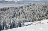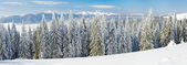 Zimowy krajobraz górski spokojny z rym i śniegu objętych świerki (widok od ośrodka narciarskiego Bukovel (Ukraina) na grań Swidowiec)