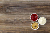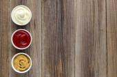 Zdjęcie "Zestaw trzech rodzajów klasycznych sosów na naturalnym drewnianym tle. Musztarda keczupu majonezowego. widok z góry z miejsca kopiowania" może być wykorzystywane do celów osobistych i komercyjnych zgodnie z warunkami zakupionej licencji Royalty-free. Obraz jest dostępny do pobrania w jakości wysokiej rozdzielczości do 5760x3840.