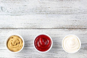 Zestaw trzech rodzajów klasycznych sosów na naturalnym drewnianym tle. Musztarda keczupu majonezowego. widok z góry z miejsca kopiowania