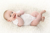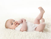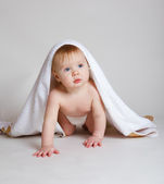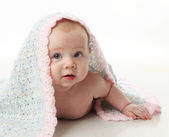 Cute dziewczynka leżąc na brzuszku z ręcznie szydełkowane koc ponad głową
